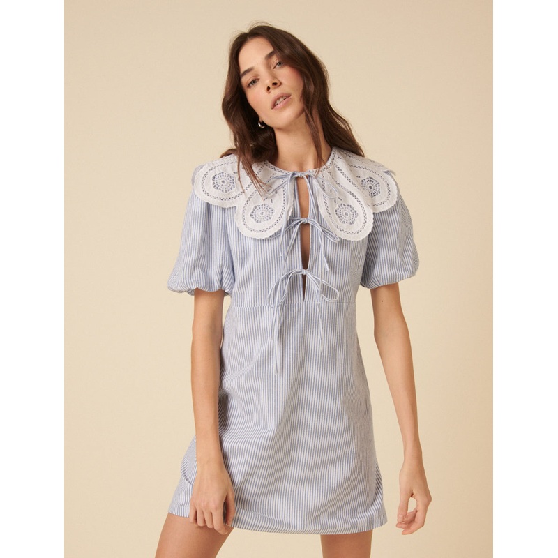A modern take on vintage charm. Coming in a classic blue and white stripe, our Bessie mini dress is complete with a white oversized collar and delicate lace trim. Were wearing ours with trainers. Short puff sleeves Oversized contrast collar with lace trim