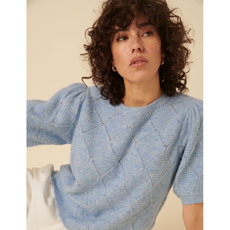 Feeling blue? This pale blue knit top features delicate pointelle details and short puff sleeves, ideal for adding texture to your look. Were wearing ours with white tailored trousers.Round neck Short puff sleevesWe recommend folding your knits to avoid an