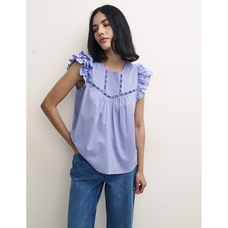 "Were really into ruffles especially on Rene. Cut in a relaxed fit, shes that cute top you can just throw on and feel good in. As always, its the details that do it for us. Team with wide leg jeans and go. Round neck Back keyhole with button Relaxed fit "
