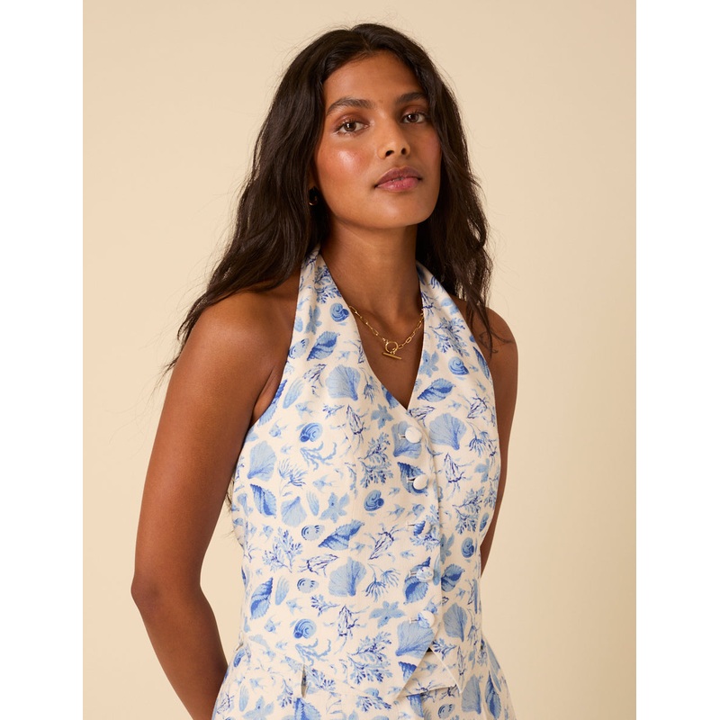 Pale blue and white shell print waistcoat with halter neck tie and covered buttons. Pair with the matching shorts for the full set. Halter neck Button front detail Size tip: we recommend your usual size