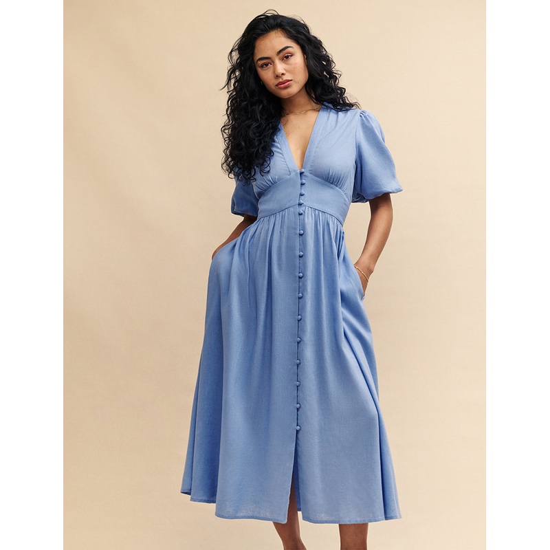 V-neck Short puff sleeves Covered buttons Side pockets Size tip: we recommend your usual size