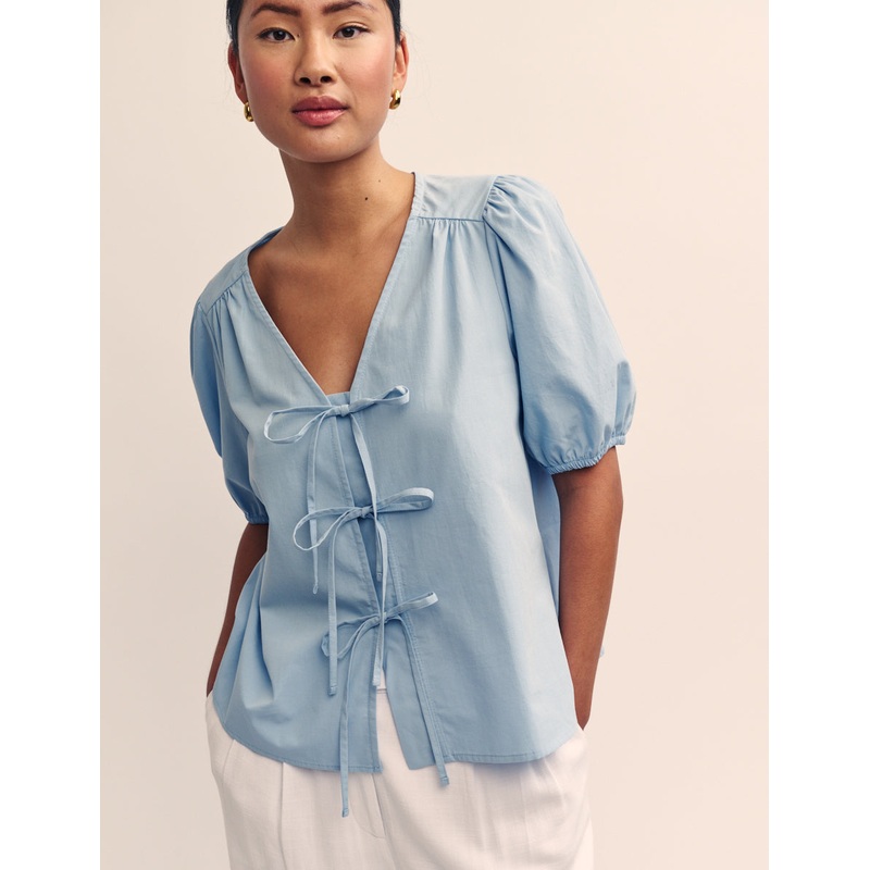 Our sell-out Bernadetta blouse is back with short sleeves for summer. This sky blue shirt comes in a stylish boxy fit with mid-length puff sleeves. For that classic so-now look, shes also finished with a trio of string ties that line the front. Elevate yours with gold jewellery.