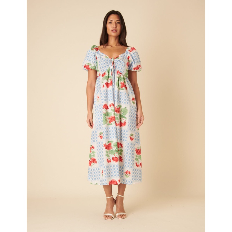 Meet your new favourite midi. Playful and sweet, our Joanna printed midi dress features puff sleeves and an empire waistline for a whimsical feel. We love the tie detailing at the sweetheart neckline too. Were wearing ours with barely-there heels.
