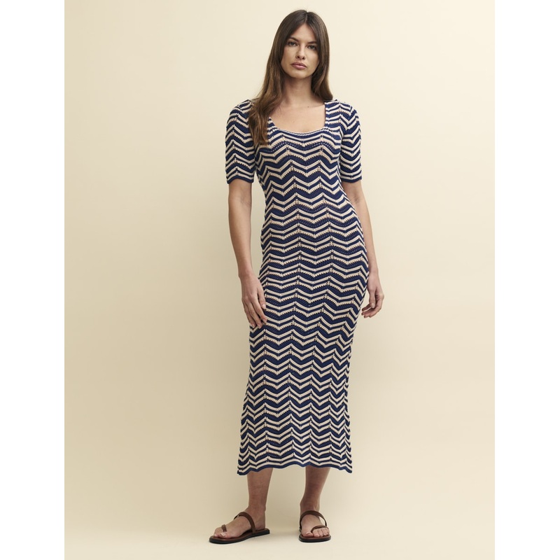 Longing for summer? We just made this crochet look dress and it wants to go on holiday with you. We love the navy wave design, finished with a scoop neckline and fluted sleeves. Wear with stompy boots now and trainers later.