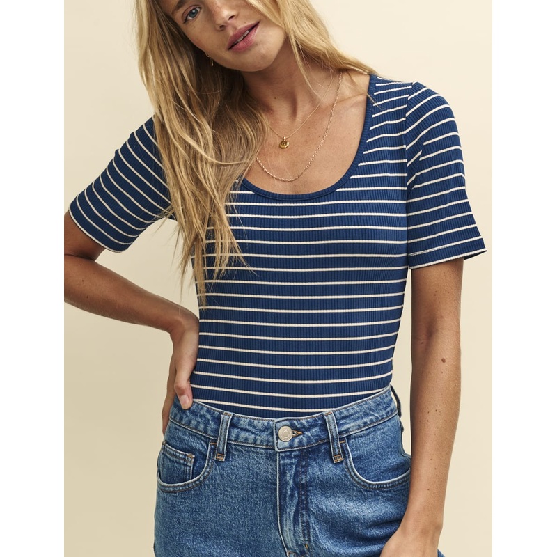 Just our cup of tee. This blue and white stripe scoop neck top comes lightly textured with a soft rib. Style yours with wide leg trousers.Scoop neckShort sleevesRibbed textureSoft stretch jersey fabricDesigned for a close cut
