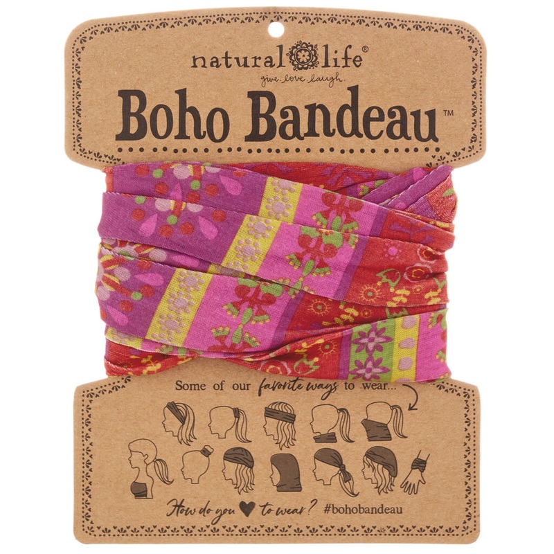 This versatile Boho Bandeau in a bright fuchsia floral stripe is the perfect accessory for girls who love to change up their style! Wrap it around your head, neck, wrist, or ponytail. Boho Bandeaus have just the right amount of stretchnot too tight that you get a headache, but snug enough to stay in place during all of your favorite activities. It comes on a card printed with 12 different ways to wear the bandeau.