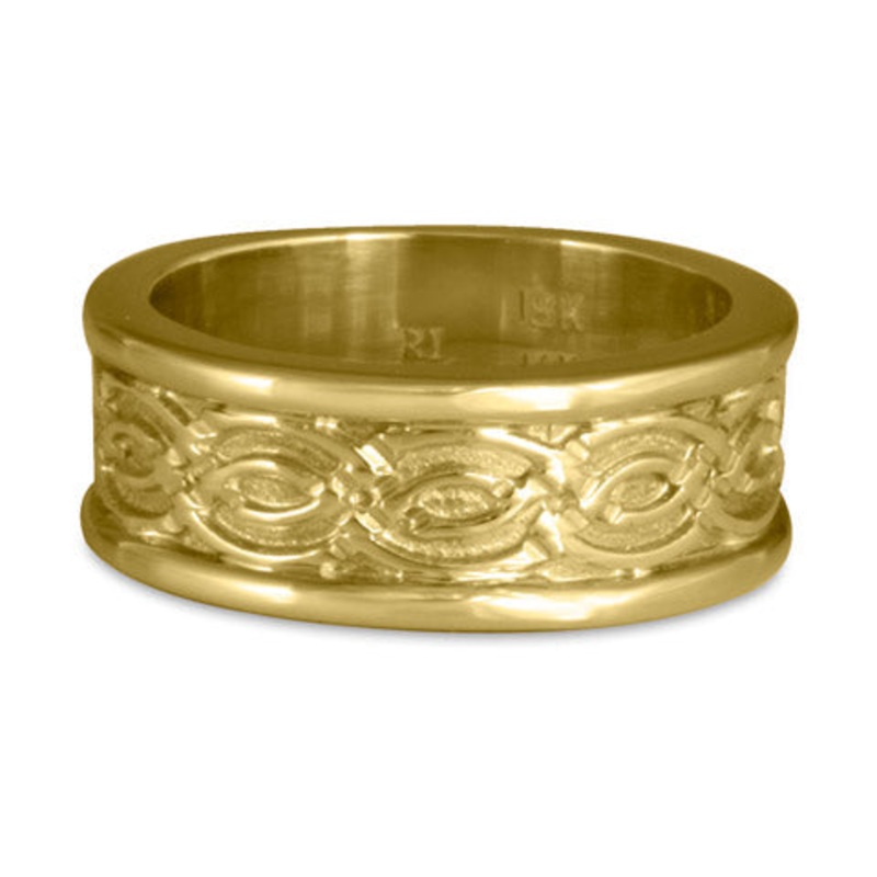 Symbolic Meaning: This ring, with four lines creating a braided pattern, suggests a relationship that is both complex and harmonious. The lines have a wave pattern in the contained boundary of the ring, representing a cyclical ease of movement through life. However, they crisscross at a regular, short interval. Since any intersection involves an exchange of energy, the motif suggests dynamic creativity within a boundary. Those who are attracted to this ring may find that common goals are clear and unified. Each line, representing a couple or family, is distinct and on a particular path yet able to work beautifully together.