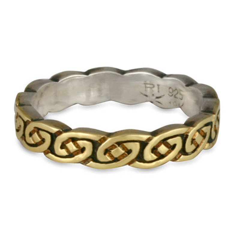 This intricately formed ring has a wonderful pattern, symbolic of integrating multiple perspectives in a harmonious whole. The pattern on the Petra Ring circles all the way around the ring. Designed by Helen in July 2005. 18K Gold over Sterling Silver Size