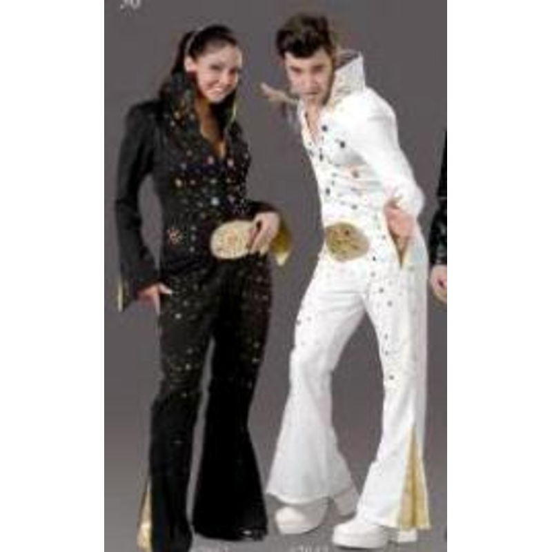 Includes: Sensational jumpsuit decorated w/multi-colored rhinestones & gold studs,high collar, bell bottom pants gold under collar, sleeve hem facings, side pantinset & ornate beltColor: WhiteSize: S (34-36), M (38-40),XL (46-48)