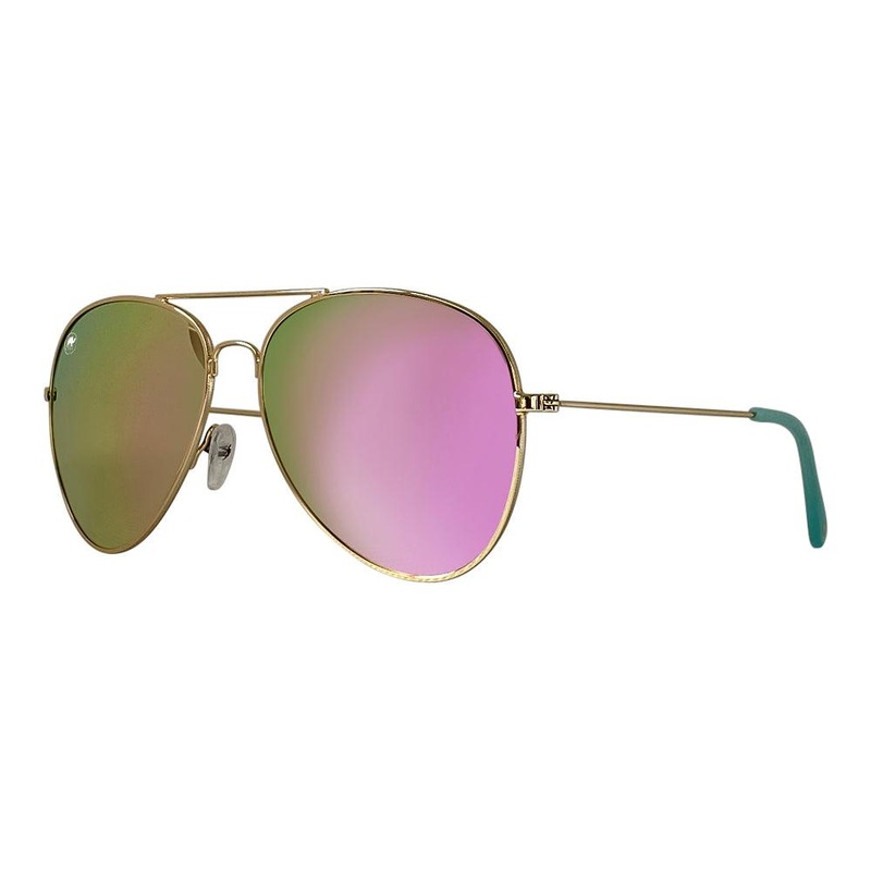 THE FLIGHT DECKCOLLECTION REG FIT- 55MM LENS - POLARIZED We had fun designing this colorway. A high gloss gold frame made with our titanium Memory Metal technology is crazy bendy but always holds true to form. The pink mirror lens is both UV400 and Polariz