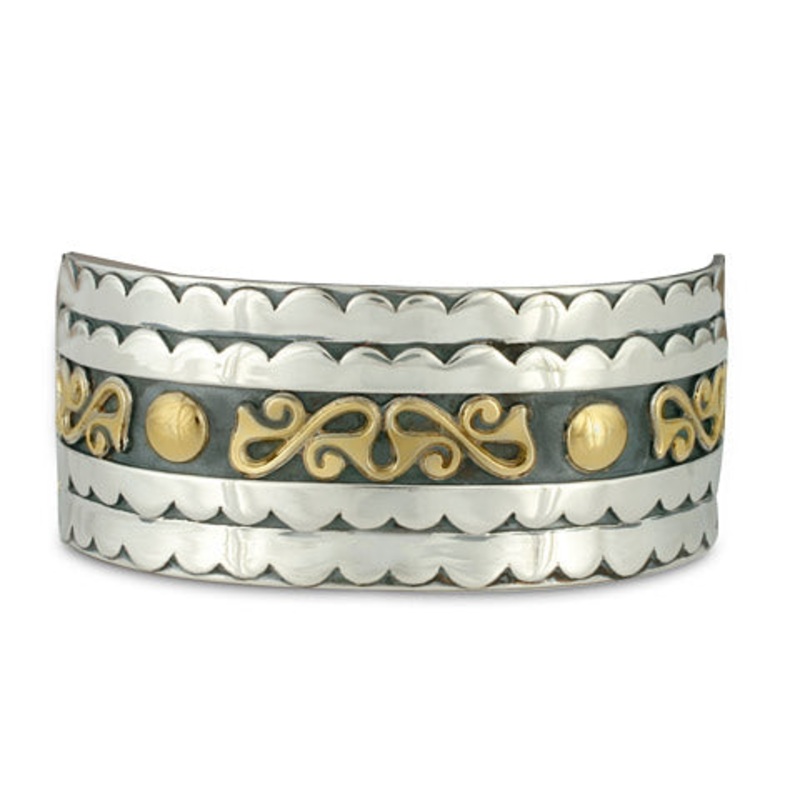 This beautiful One-of-a-Kind Bridget cuff is a masterpiece of linework, silver and gold. A piece inspired by the magnificent and finely crafted wood and artwork within our Basillica, the Cathedral of St. Francis of Assisi, located here in Santa Fe. The det