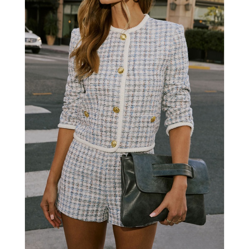 Take your style to new heights with the Brinkley Cropped Tweed Jacketa piece that effortlessly blends timeless charm with a modern edge. The classic tweed fabric exudes sophistication, while the cropped cut and padded shoulders give it a bold, confident vibe. Pair it with the matching tweed shorts for a head-turning set or layer it over a simple dress for a fresh twist on classic style.