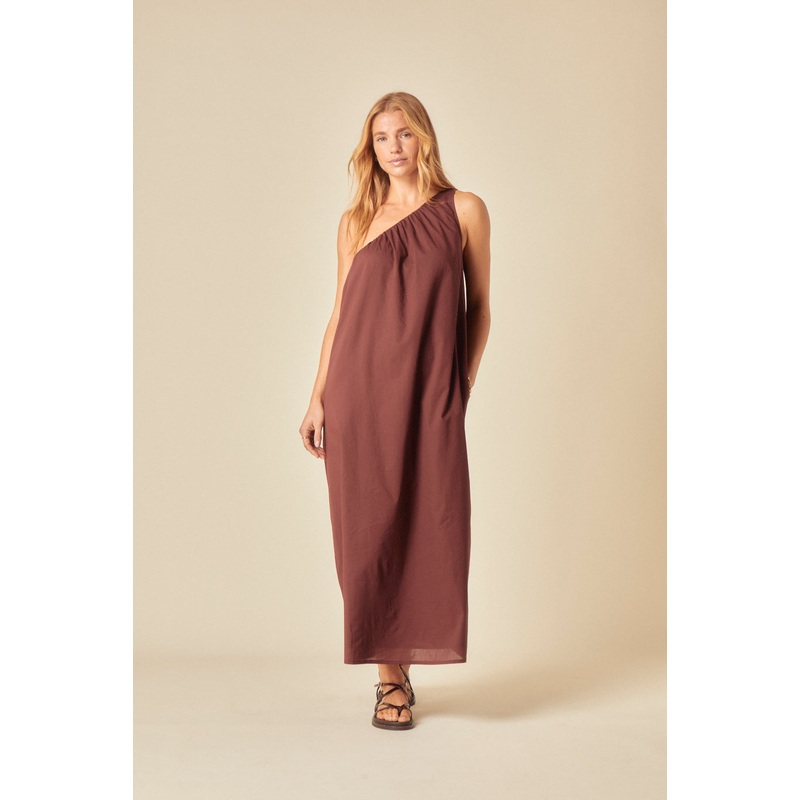 A one-shoulder moment. This brown midi dress is the definition of easy, breezy style, with an elasticated one-shoulder design and a relaxed, oversized fit thats made to swish.