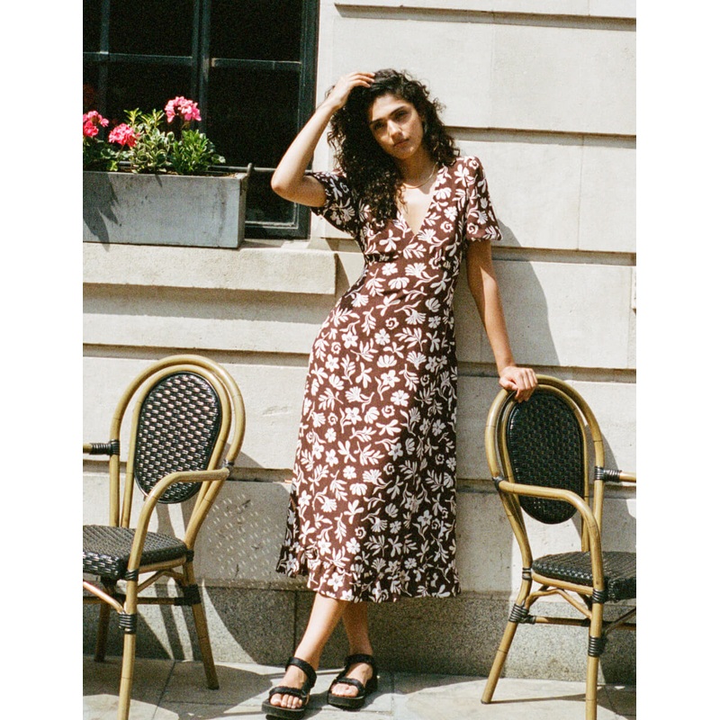 Brown Botanical Print Delilah Midi Tea Dress