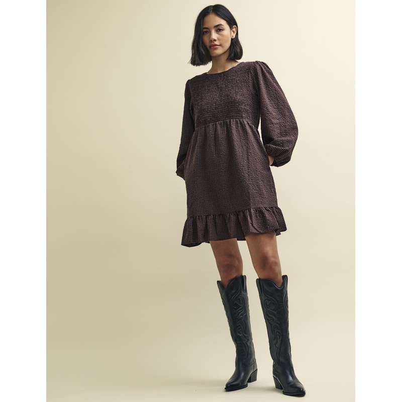 Our girl Kelsie is back for winter as a mini dress with ultra-voluminous sleeves. Decorative shirring around the waist is as flattering as it is comfortable. Details include ruffle trims and a keyhole back finished with a statement bow. Dial her down with stompy boots.
