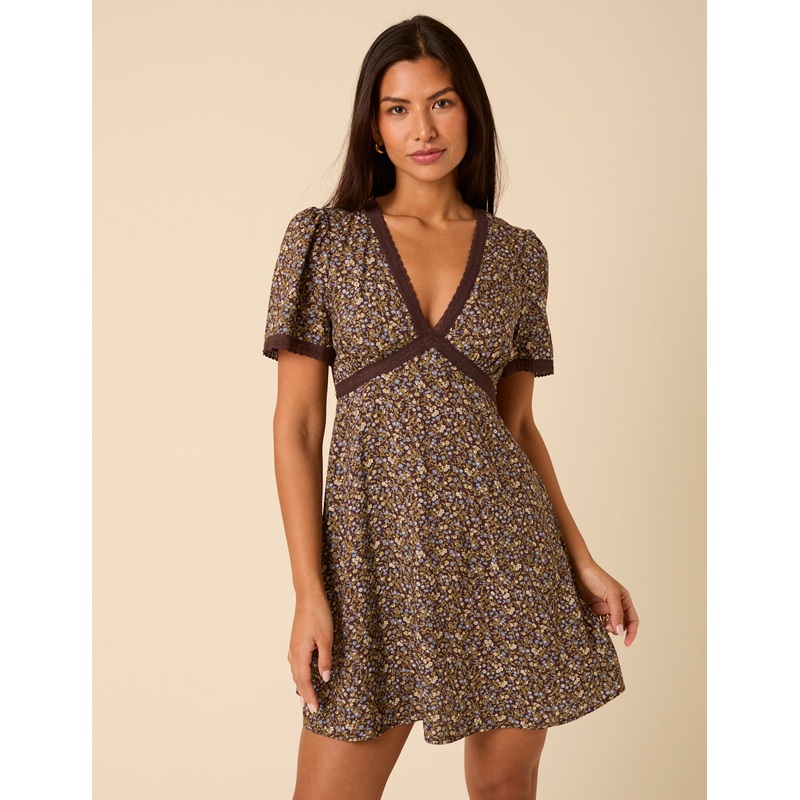 Brown Floral Lace Trim Kharian Mini Dress