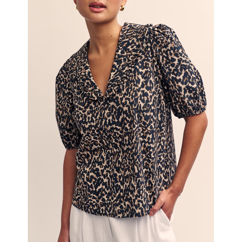 Were obsessed with an oversized collar. Trimmed with a flouncy ruffle, this classic black shirt dips into a v-neckline. We also love the puff sleeves. Style yours with jeans and gold accents. Drop collar Mid-length puff sleeves Button front Boxy fit