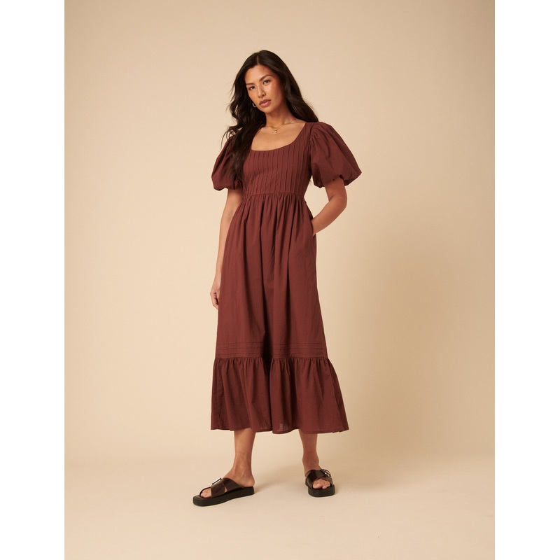 Brown Puff Sleeve Mimi Midi Dress