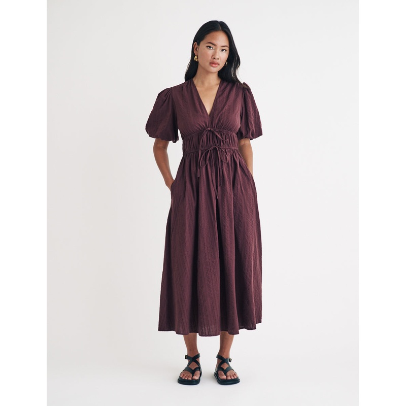 Brown Puff Sleeve Scottie Midi Dress