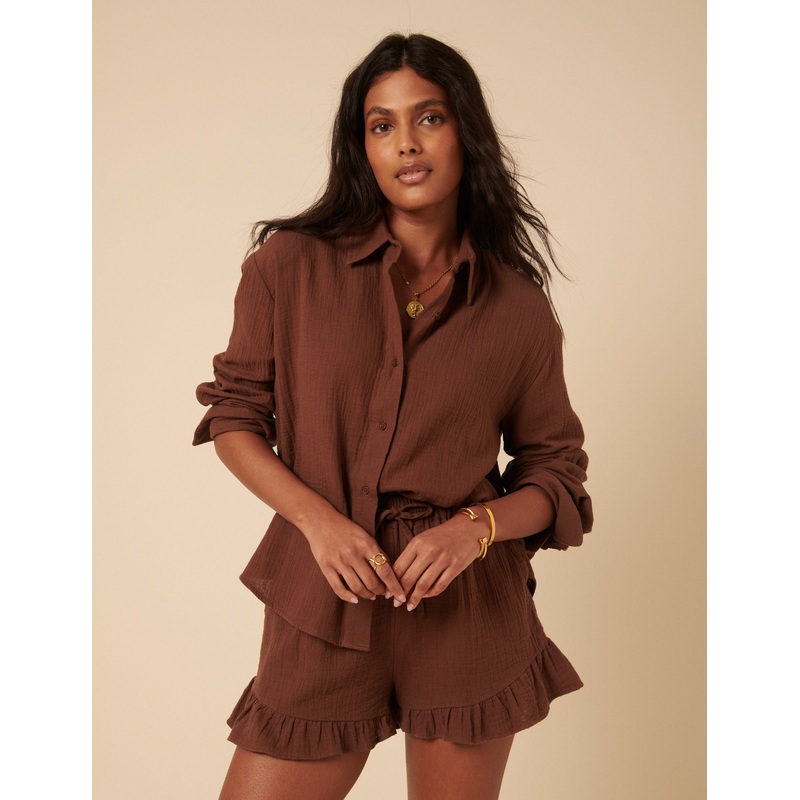 Breezy meets buttoned-up. This brown shirt comes in a soft, lightweight feels with deep cuffs and matching buttons. For the full vibe, just add the shorts. Collar Button front Size tip: we recommend your usual size