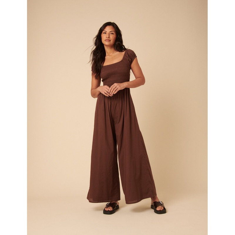 Jump to it. Coming in chocolate brown, our jumpsuit features a shirred bodice with trendy drop waist detail. We love the floaty wide leg too. Just add sandals. Square neck Shirred bodice that defines the waist Wide leg cut that skims the body Size tip: we