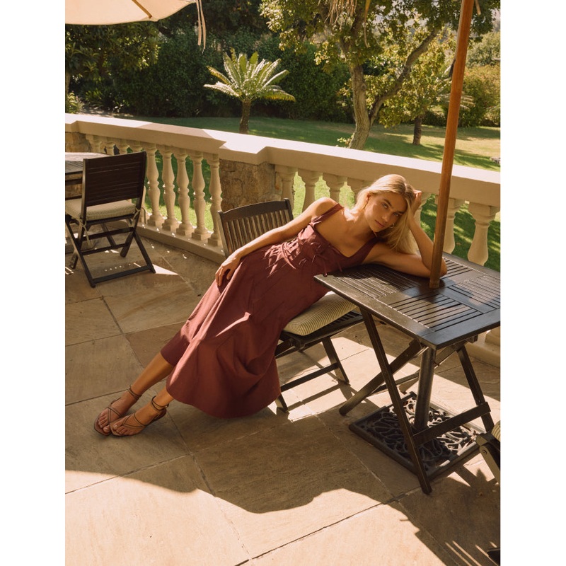 Perfect in Penelope. Coming in the trending shade of the season, our chocolate midi dress is designed with a pleated bodice with bow detailing and thick straps. Its flowy A-line skirt is perfect for twirling through your day, whatever it has in store. Weve styled ours with barely-there heels.