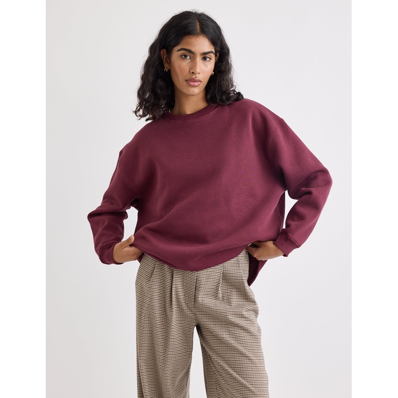 The ultimate casual wardrobe classic. Its oversized cut and crew neck are perfect for those laid-back days. Coming in so-now burgundy, consider it your go-to piece for when comfort is key but styles still a priority. Were styling ours with leggings and trainers.