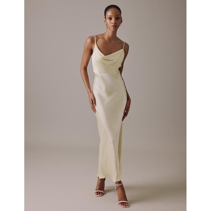 Walk down the aisle in style with the NC bridal party collection. This butter yellow slinky slip is framed by barely-there straps and a soft cowl neckline thats perfect for summer weddings and far-flung destinations. Cut on the bias, the lightly flared midaxi hem is effortlessly flattering. Its finished with pretty tie-back detail for the perfect fit. Style elegantly with strappy sandals and a single stem.