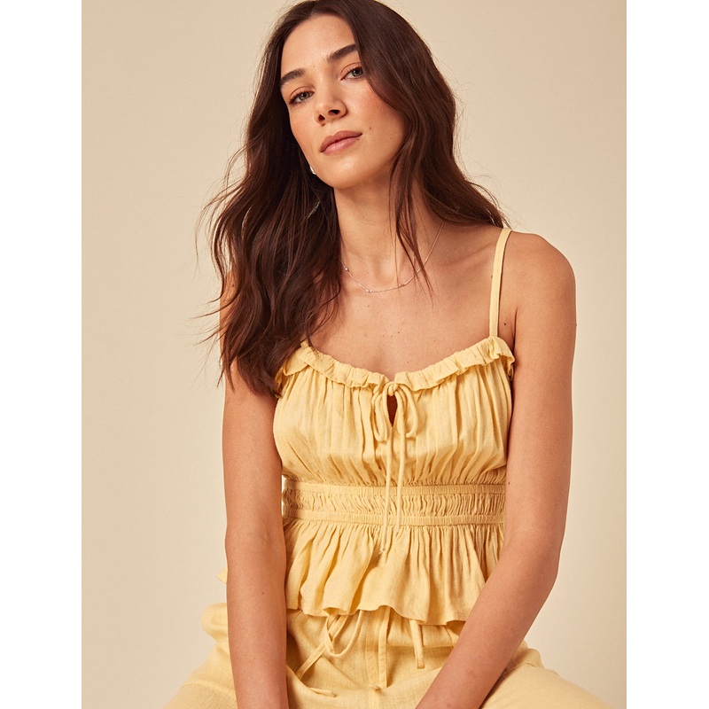 Serving sunshine. Our yellow cami top is one youll wear on repeat this summer. Adorned with dainty florals, we love the playful ruffle detailing and tie front detail for a feminine touch. Its perfect for layering or wearing solo on warm days.