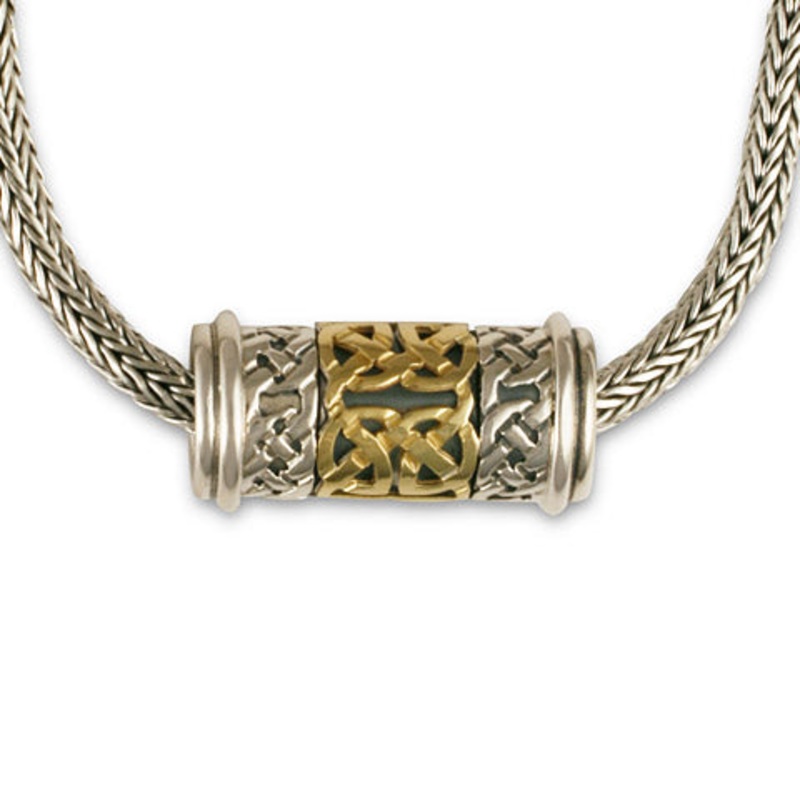 The elongated bead-like piece is the pendant itself. The ability of movement within this piece is what makes it unique. The golden knot-work that wraps around the sterling silver base is our Scroll design. The Scroll design represents the development of personal foundations and structures that are complex yet functional. The chain it rests on is our 3mm handwoven silver chain.