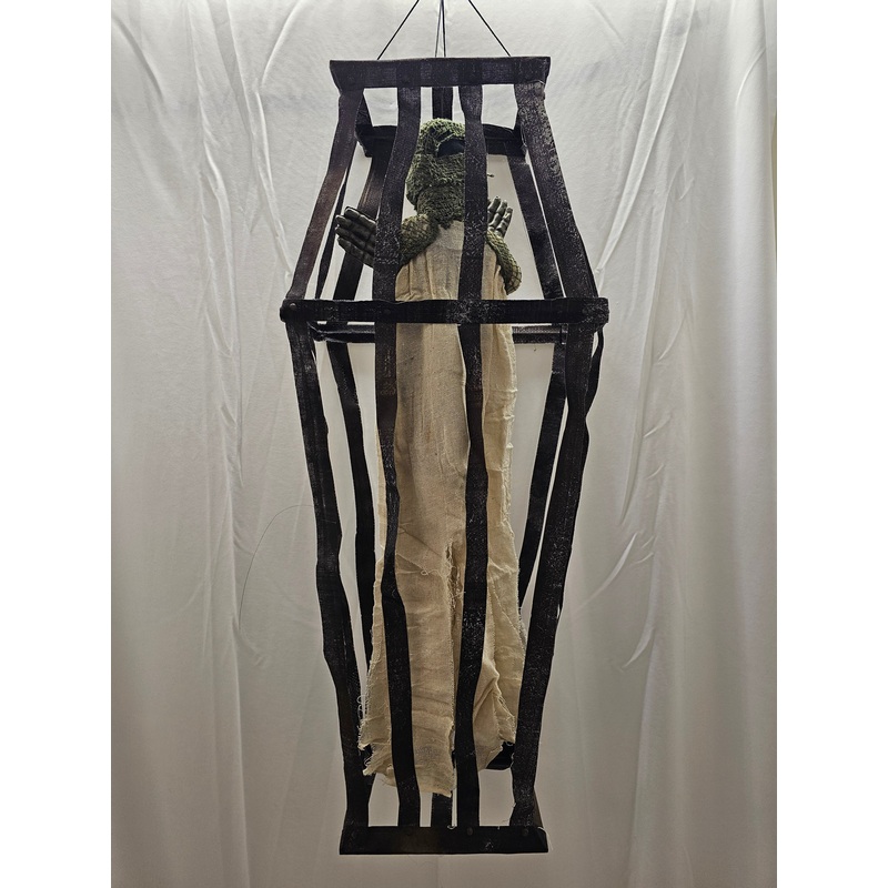 Caged Creature Hanging DecorLightweight & No Assembly!Richly detailed cage creature has authentic look, weight & feel!Great for graveyard scenes, haunted houses and partiesCollapsible for easy storageCreate an eerie Halloween scene by hanging this Caged Cr