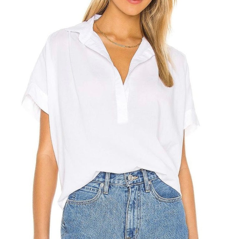 Cali Dreaming Motley Top in White. BEST SELLER!100% CottonThis top is as easy to wear as a classic tee. This relaxed style features a slightly dropped sleeve, placket and collar. Constructed in 100% cotton, madestart to finish in Los Angeles, California.Me