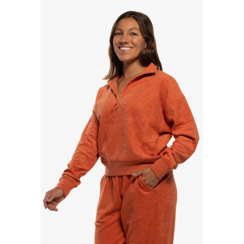 The Callie 1/4 zip long sleeve top is made from lightweight baby terry cloth with mini-looped terry on the outside and super-soft double brushed jersey on the inside. The perfect alternative to a fleece sweatshirt in warmer weather. Throw it on when you get out of the water or whenever you want to embrace a 70s vibe.
