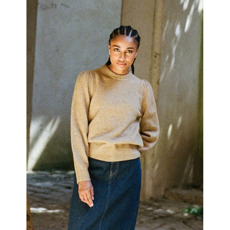 This biscuit-coloured jumper is a classic. Style yours with cargo trousers or half-tucked into jeans. Crew neck Long balloon sleeves Ribbed trims