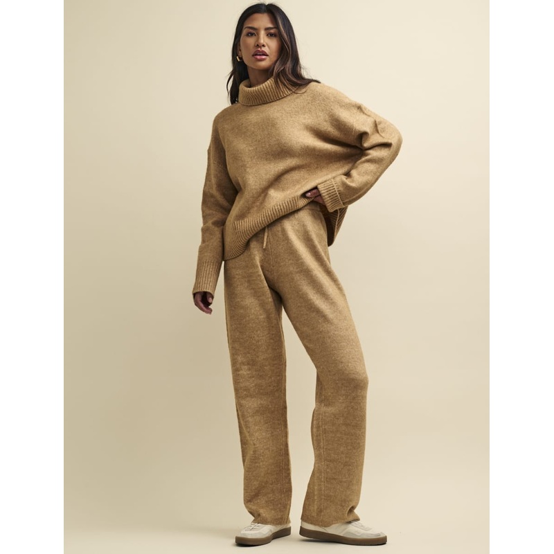 Relax in style. These knitted wide leg trousers are so toasty in biscuit. A drawstring waist will ensure youre supremely comfortable all day long. Wear yours as a set. Ribbed trims Drawstring waist for comfort Wide leg cut that skims the body Designed for
