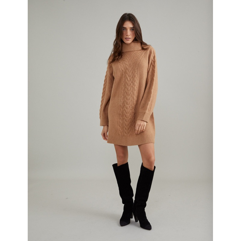 The throw-on-and-go dress. Designed with a chunky cable knit texture, youll reach for our camel mini dress again and again. We love the high neck and long sleeves with thick ribbed trim detailing. Were pairing ours with knee-high boots.