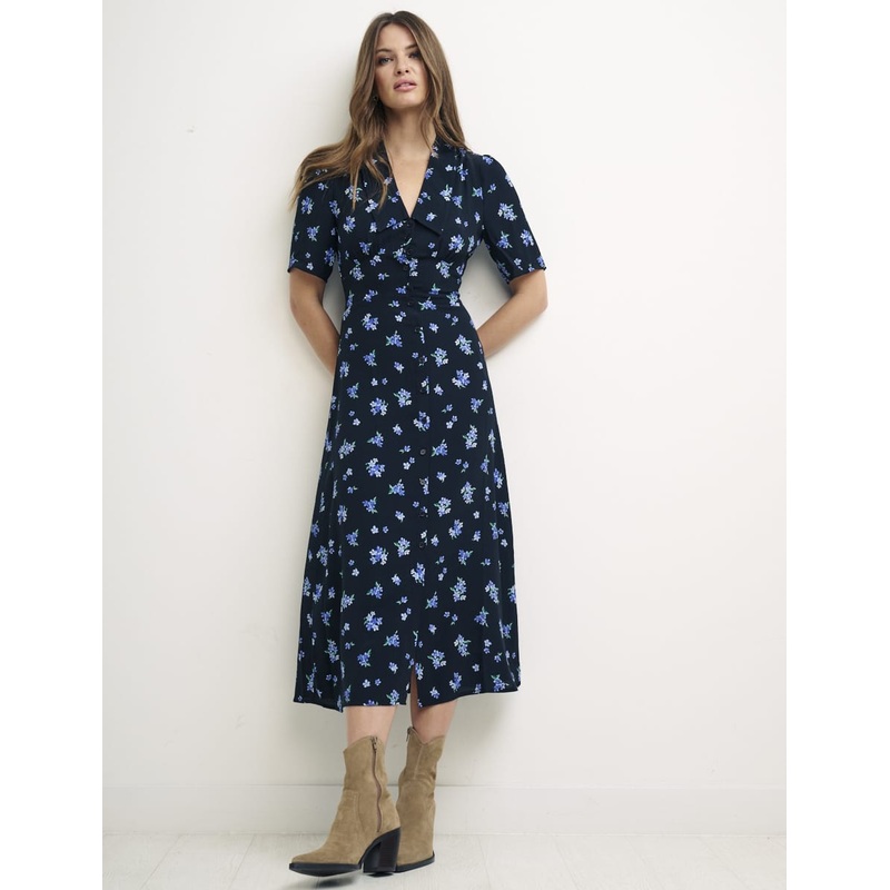 Our Daisy dress taps a 1970s feel. This black version is patterned with soft blue forget-me-nots and falls to a classic midi length with a button-through front. We love it with chunky flat boots.V-neckLong sleeves Button-through front