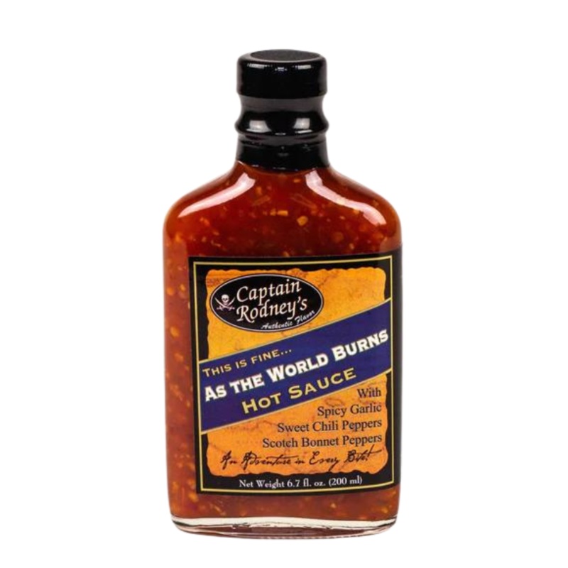 6.7 fluid ounces.We have made this hot sauce for our own table for many years and guests always asked why we did not sell it. The simple answer is, we did not have a name for this one, it was just “our” hot sauce. But all that changed one day in the kitchen when inspired by Alfred, Jellyman dubbed it “As the World Burns”. So there you go, our hottest sauce, combining flavorful Scotch Bonnet Peppers with sweet chilis for an in your face heat, balanced with a nice, smoky garlic finish. Spicy and complex with enough heat to make you sit up and pay attention, without sacrificing flavor. Truly, this is fine…