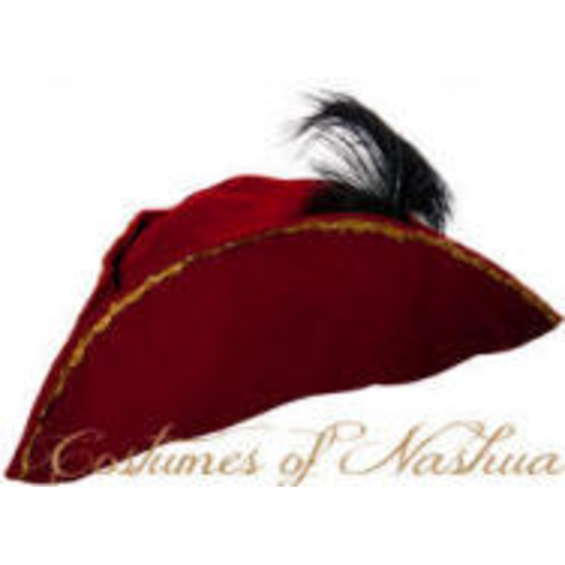 This fabulous velvet tricorn hat is adorned with heavy gold trim and one feather plume. Its rare to see a captain without his hat. The perfect finishing touch to an awesome costumeColors: Black, Red, Burgundy, Purple, Blue, TanSize: M, LA70217 / A70218