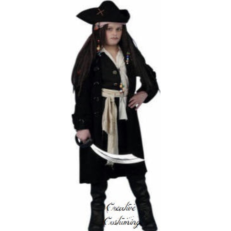 Pirate ChildIncludes: Knee length black jacket accented w/black braid trim, four 1" buttons, & rolled up cuffs, vest w/buttons, long sleeved shirt, knicker pants, waist sash & black tricorn hat.Color: Black (shown)Child Size: S (4-6)