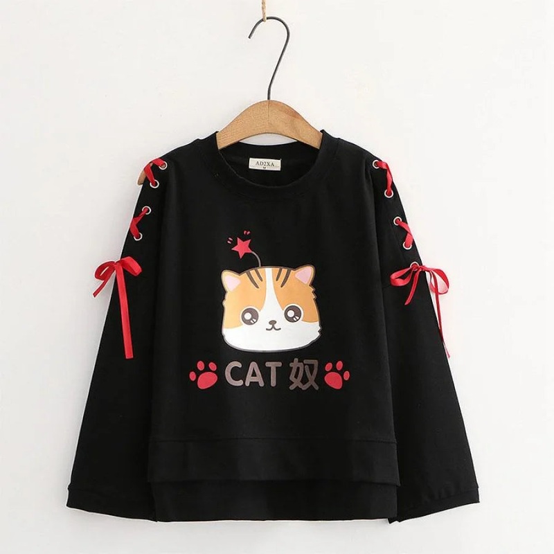Be the first to review “Cartoon Cat Star Print Lace Up Bow Sleeves Sweatshirt J10011 Black M”