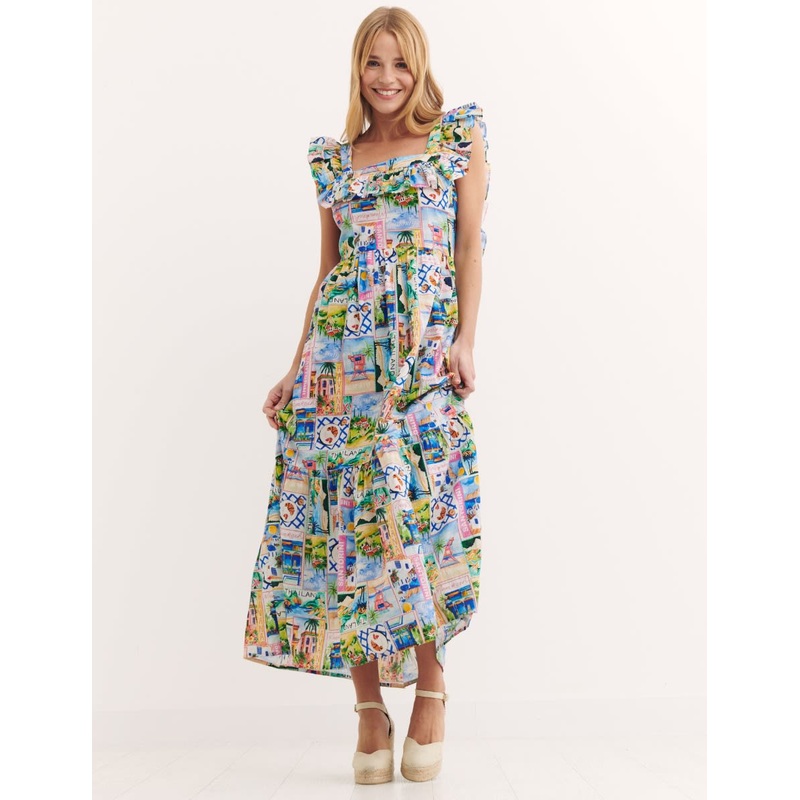 Decorated with a vibrant postcard print, our Cassidy midi dress is the perfect piece to put you in the holiday mood. It cuts a flattering silhouette thanks to the flowing skirt, open detailing and square neckline. Ruffles decorate both the front and the ba