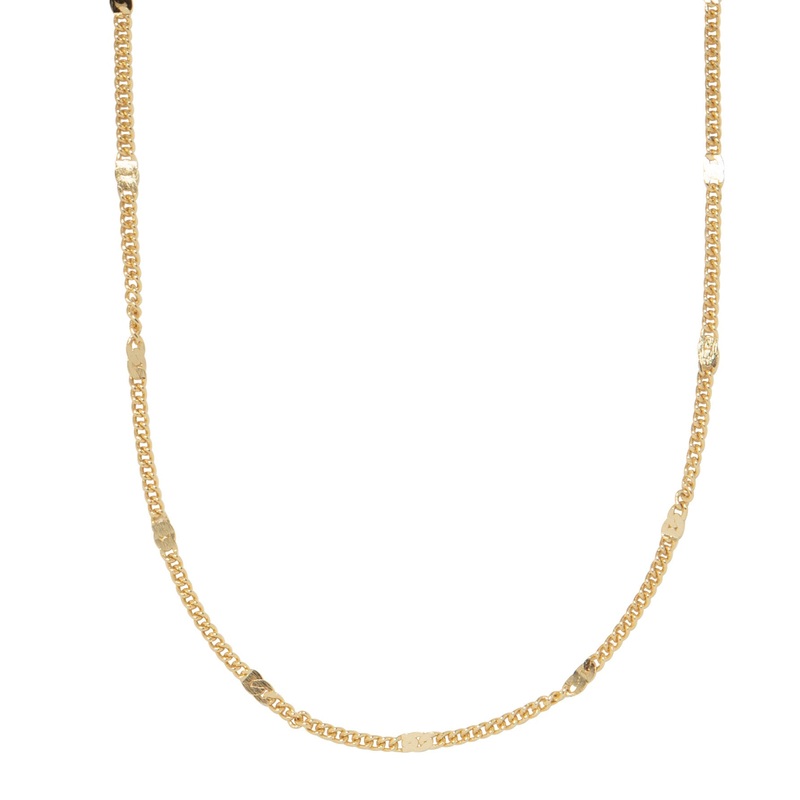 Gorgeous, gold-plated necklace with an appealing texture. The classic chain has been given an enchanting pattern in the form of flattened links placed at regular intervals. A simple design with a powerful effect. The chain is 50 cm long with a 9 cm extension chain, so it can be perfectly positioned on your dcolletage. A charming chain that could quickly become a classic.
