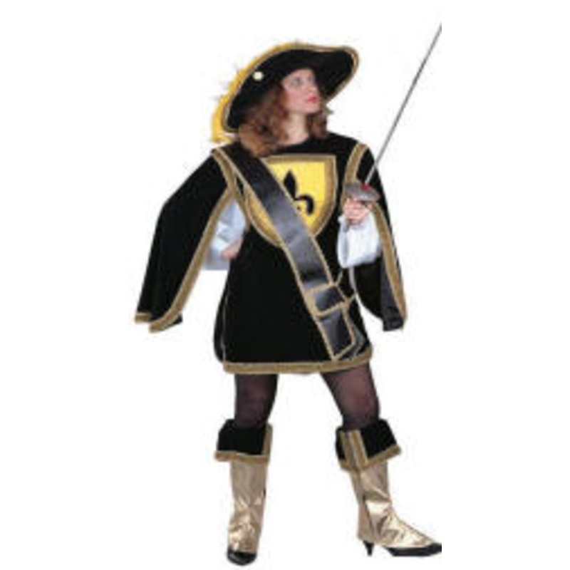 Includes: Velvet hat with gold metallic trim, leotard with long linen sleeves, velvet tunic with crest, matching sword sash and gold boot tops with velvet cuffs. All with gold metallic trim.Color: Black, Blue, Green,Red, Rust, WhiteSize: S (6-10), M (10-14