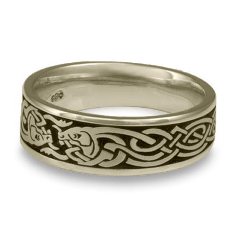 The Celtic Hunt Wedding Ring displays the strength and power that can be found in love. Two hunters, the hunted, or a pair coming together, drawn together in love.Crafted by Katherine Aberle with eco-friendly methods using recycled 14K White Gold. It is se