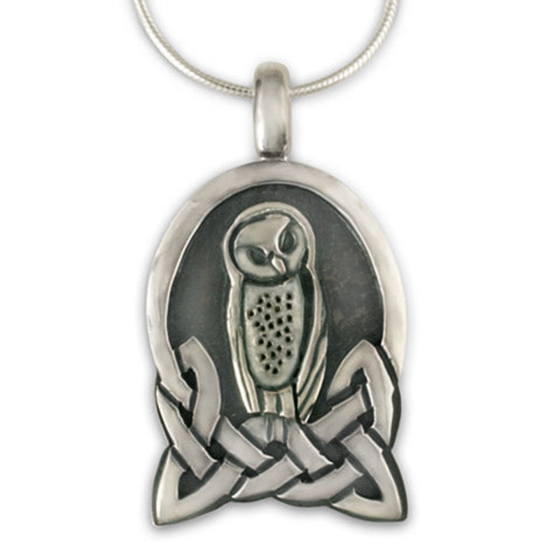 The Celtic Owl pendant displays an owl nested in Celtic knots. As we prepare to honor our Ancestors during the time of Samhain, we also honor the Owl as guardian of the spirits of those who have gone before us.Sterling SilverDimensions: 1 7/16" Long x 1 3/