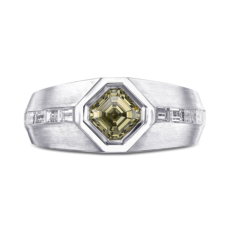A stunning Chameleon asscher diamond men’s ring, with a center diamond weighing 1.03ct and certified by GIA. The diamond is accented by collection color baguettes side stones styled in a Chanel setting, and the ring is mounted in 18k white gold.