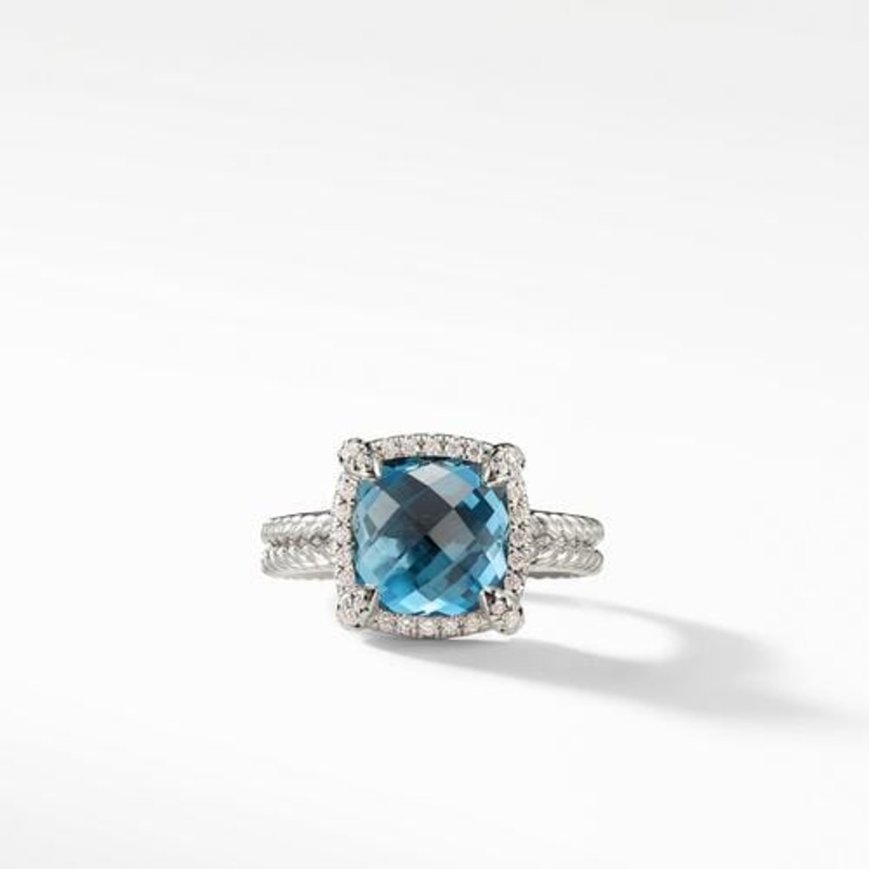 Sterling silver Faceted Hampton Blue Topaz, Pav diamonds, 0.14 total carat weight, Ring, 9mm. Size: 7.