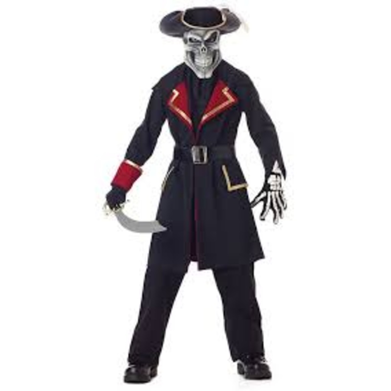 Includes: Coat, Skull Mask,Pirate Hat w/Feather, Belt & GloveColor: Black (shown)Child Size:M (8-10)