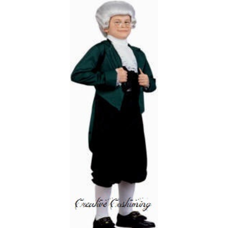Thomas JeffersonThird president of the United States, founding father & a framer of the Constitution.Circa 1801Includes: Green colonial style jacket w/attached vest, breeches, white ruffled lace jabot & cuffs.Child Size: S (4-6)Colors: Green